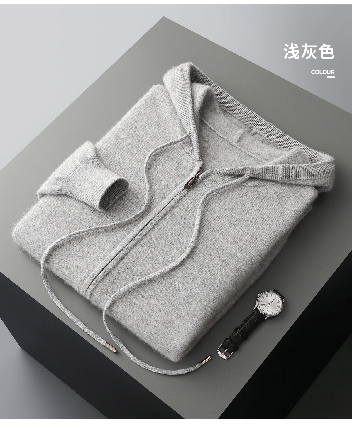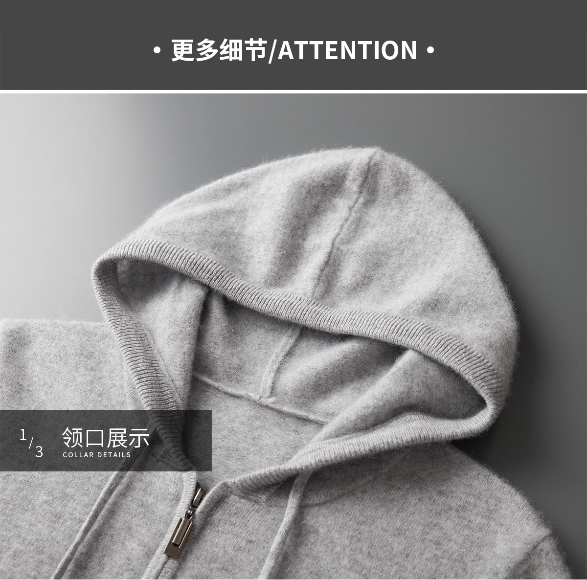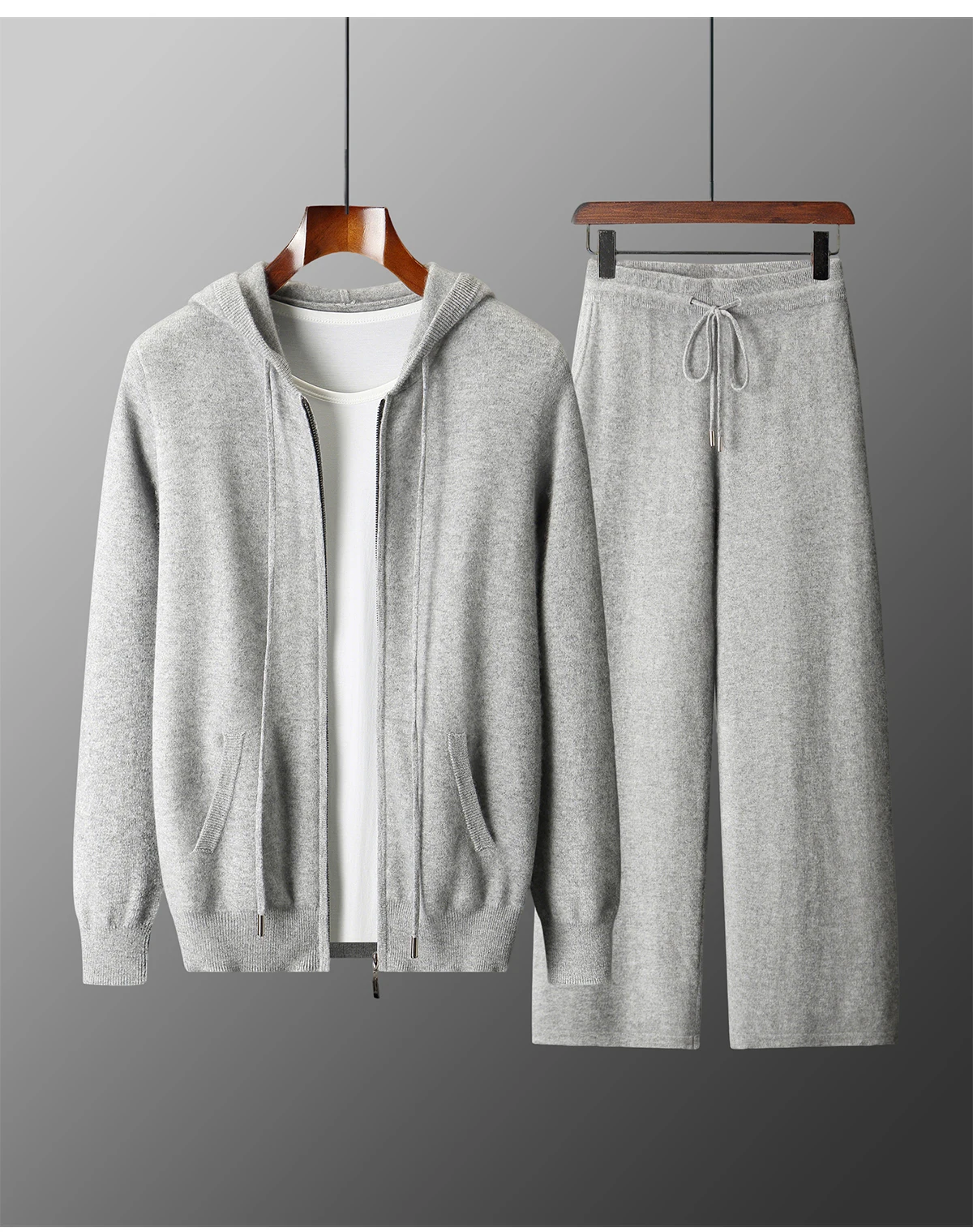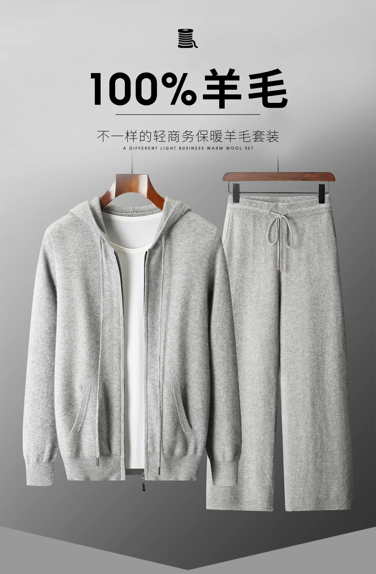 Men's Two-piece Sets 100% Merino Wool Knitting Hooded Collar Cardigan and Wide-leg Pant Autumn Winter Thickened Warm Clothing